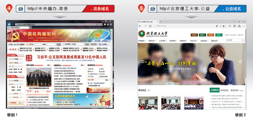 “.政务”和“.公益”是党政机关和事业单位专用中文顶级域名,具有唯一性、高度可识别性,以及由机构编制部门严格审核等特性,成为可以证明机构网络身份有效性的“网上身份证”。如:“国务院.政务”、“中央编办.政务”、“北京理工大学.公益”、“中国科学院.公益”等。