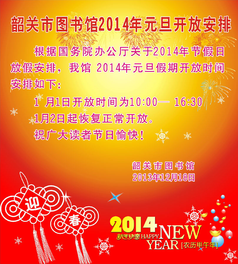 韶关市图书馆2014年元旦开放安排