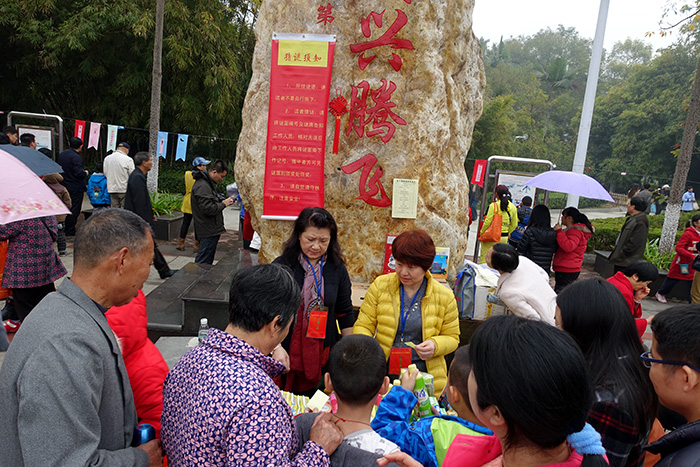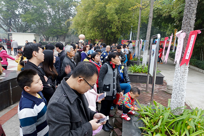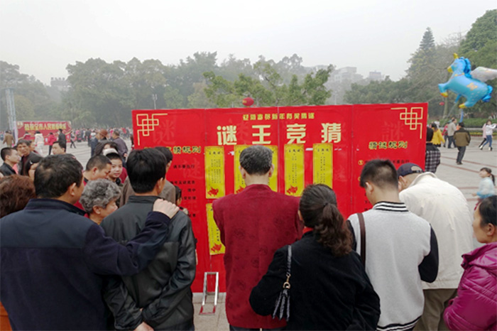 节日的韶城人流如潮,在市中山公园文化广场一条条彩绳上挂满了五彩缤纷的谜条,吸引了众多市民驻足观看,并踊跃参与。在兑奖处,许多猜对谜底的市民兴高采烈地排成了长队等候兑奖。有市民表示,这样的活动彰显了中国传统文化的魅力,宣传了相关的政策法规,也让年味更浓了。下图为猜谜活动现场。