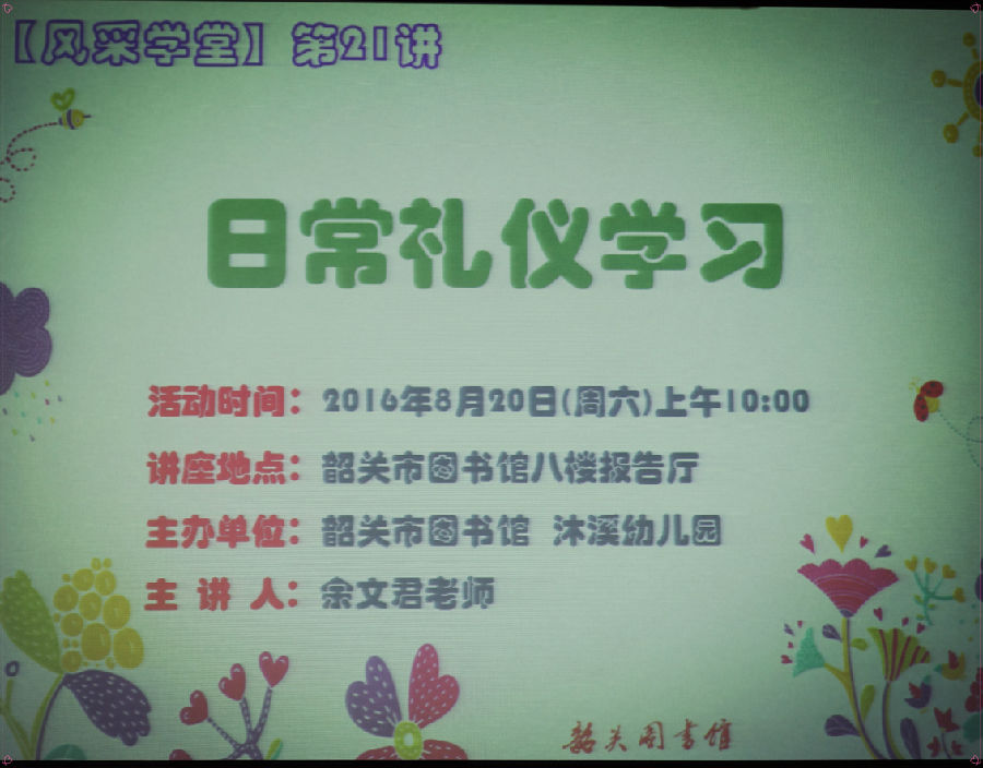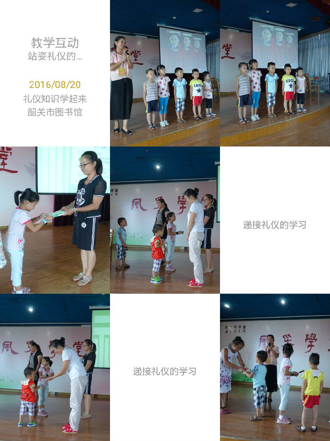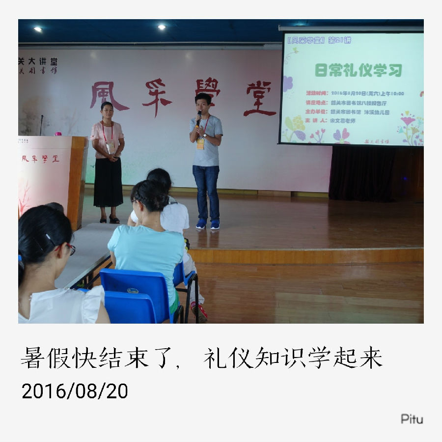 8月20日,由韶关市图书馆与沐溪幼儿园共同主办的【风采学堂】第21讲—— “日常礼仪学习”在我馆八楼报告厅举办,活动吸引了逾20多个家庭参加。