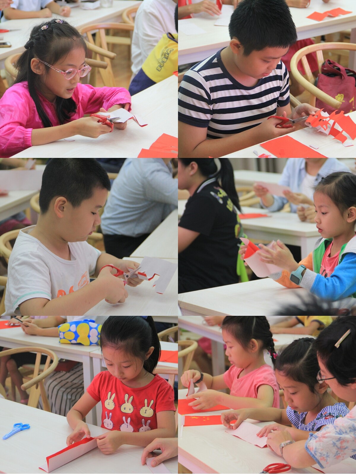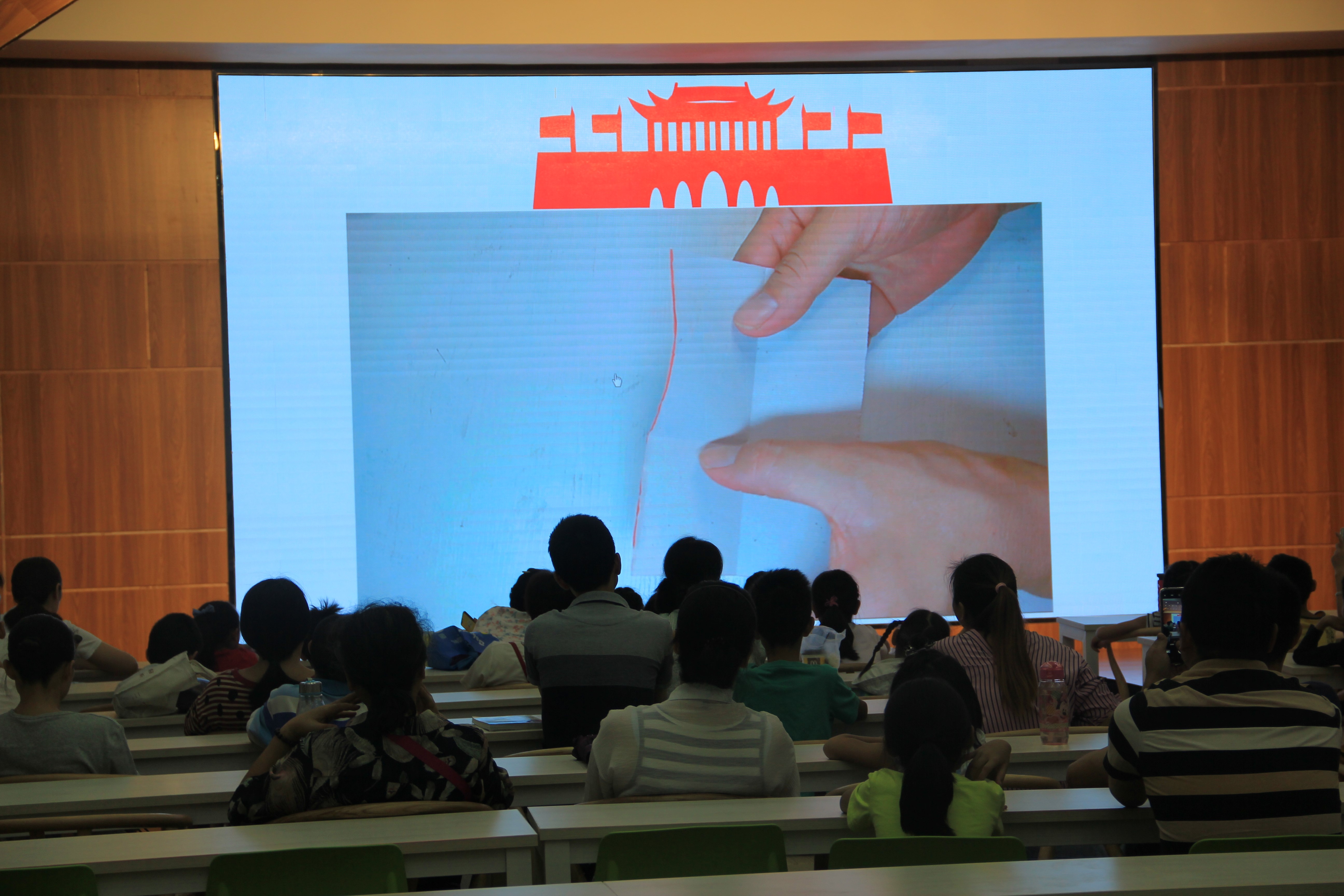 潘老师首先在大屏幕展示北京天安门画面,给小朋友们讲述国庆节的来历和天安门城楼的结构等,唤起国人对我们伟大祖国的热爱,为我们伟大祖国繁荣昌盛而骄傲,弘扬爱国主义精神。接着通过现场实操和视频教学的方式,深入浅出地给小朋友讲解如何剪天安门城楼每一个步骤的折叠和剪法,小朋友们纷纷拿起手中的剪刀,在家长的协作下,通过剪纸的艺术形式来描绘自己心中的祖国,表达对祖国的热爱。