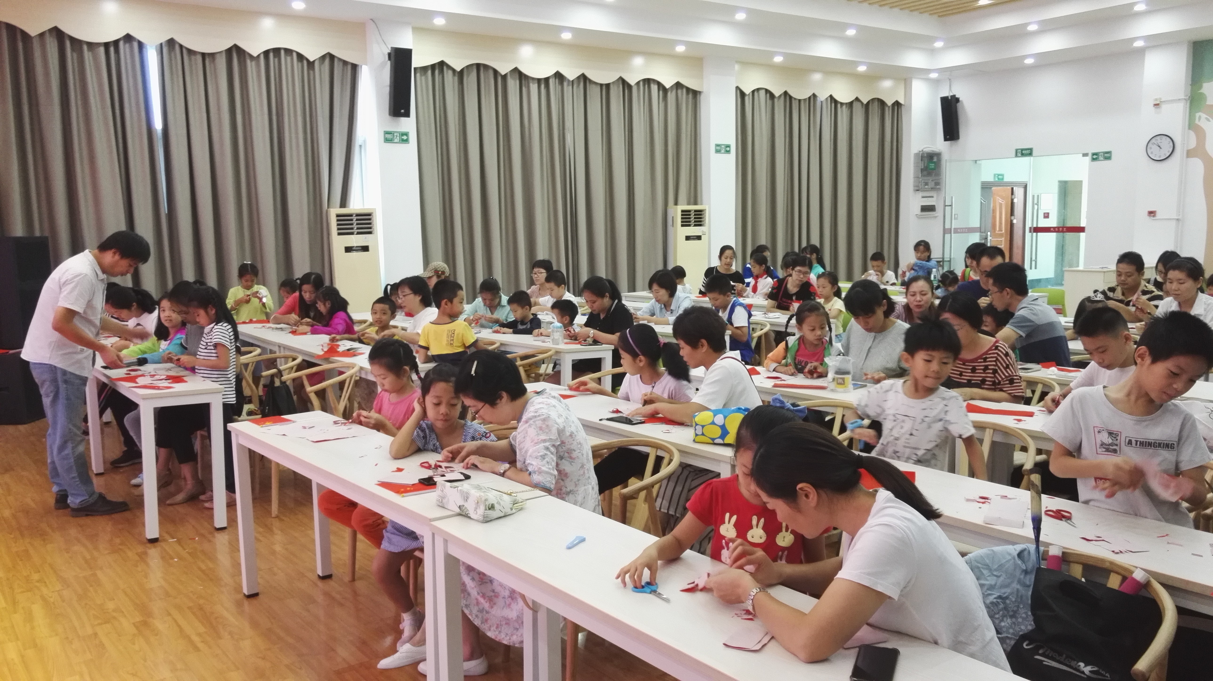 10月1日上午10点,由韶关市图书馆与韶关市剪纸学会联合主办“和剪纸艺术家一起学剪纸(7)我心中的祖国”在我馆八楼报告厅举行。本次活动由韶关市剪纸学会会长潘奇老师主讲,吸引了30多个家庭参加,有的是在韶关市图书馆微信公众号报了名的,有的是通过韶关新闻媒体慕名而来的,值得一提的是有一对七八十岁的老夫妇对剪纸特别感兴趣,也是通过这种方式而来,可见新闻媒体的力量多么强大。