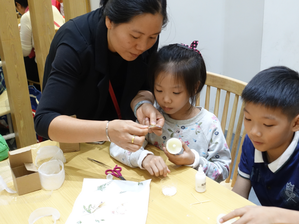雷乔青先是介绍了压花的基本知识,比如压花所需的材料,压花的艺术性和趣味性等等,让在场的大人和小朋友对压花艺术有大概的了解。工作人员随后发放了蜡烛和花材,让大家亲自动手,体验压花的乐趣。