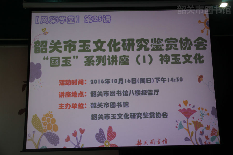 10月16日,由韶关市图书馆和韶关市玉文化研究鉴赏协会联合主办的【风采学堂】第25讲、“国玉”系列讲座第一讲神玉文化在我馆八楼报告厅开讲。神玉文化是中国历史上极为重要的独特的文化现象。在人类没有文字的史前时期,它以独有的、特殊的渗透力影响着世俗社会的方方面面,从中我们不仅看到了当时的文化风貌、社会习俗,也看到了贫富差距,等级阶层,更看到了人类社会的萌芽和发展。玉文化对中华文明的奠基作用和起源认识是任何其他社会意识形态都无法替代的。