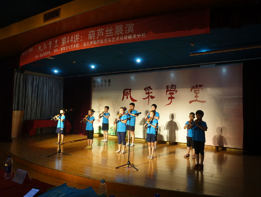 涂志民老师讲罢,便是云之声葫芦丝巴乌艺术学校韶关分校学员的表演环节。