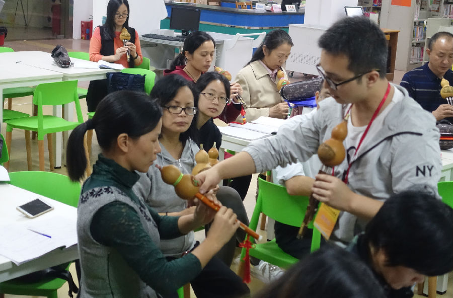 截止本周,活动已经开办了4期。主讲人涂秋宋老师已经给学员们传授了葫芦丝的吹奏技巧以及《龙的传人》、英国儿歌《我有一只小羊羔》、云南哈尼族民歌《其多列》等总计6、7首曲子。每一首曲子都是涂老师耐心传授,始于简谱,终于器乐。