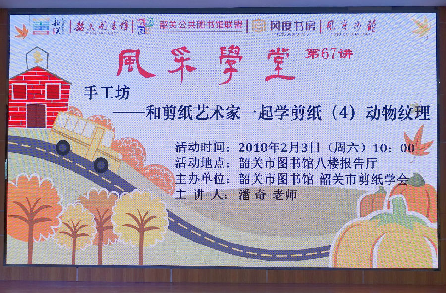 2月3日上午10点,由韶关市图书馆、韶关市剪纸学会联合主办的【风采学堂】第67讲:手工坊——和剪纸艺术家一起学剪纸(4)动物纹理在我馆八楼报告厅举行。本次活动由韶关市剪纸学会的潘奇老师主讲,吸引了20多个家庭参加。