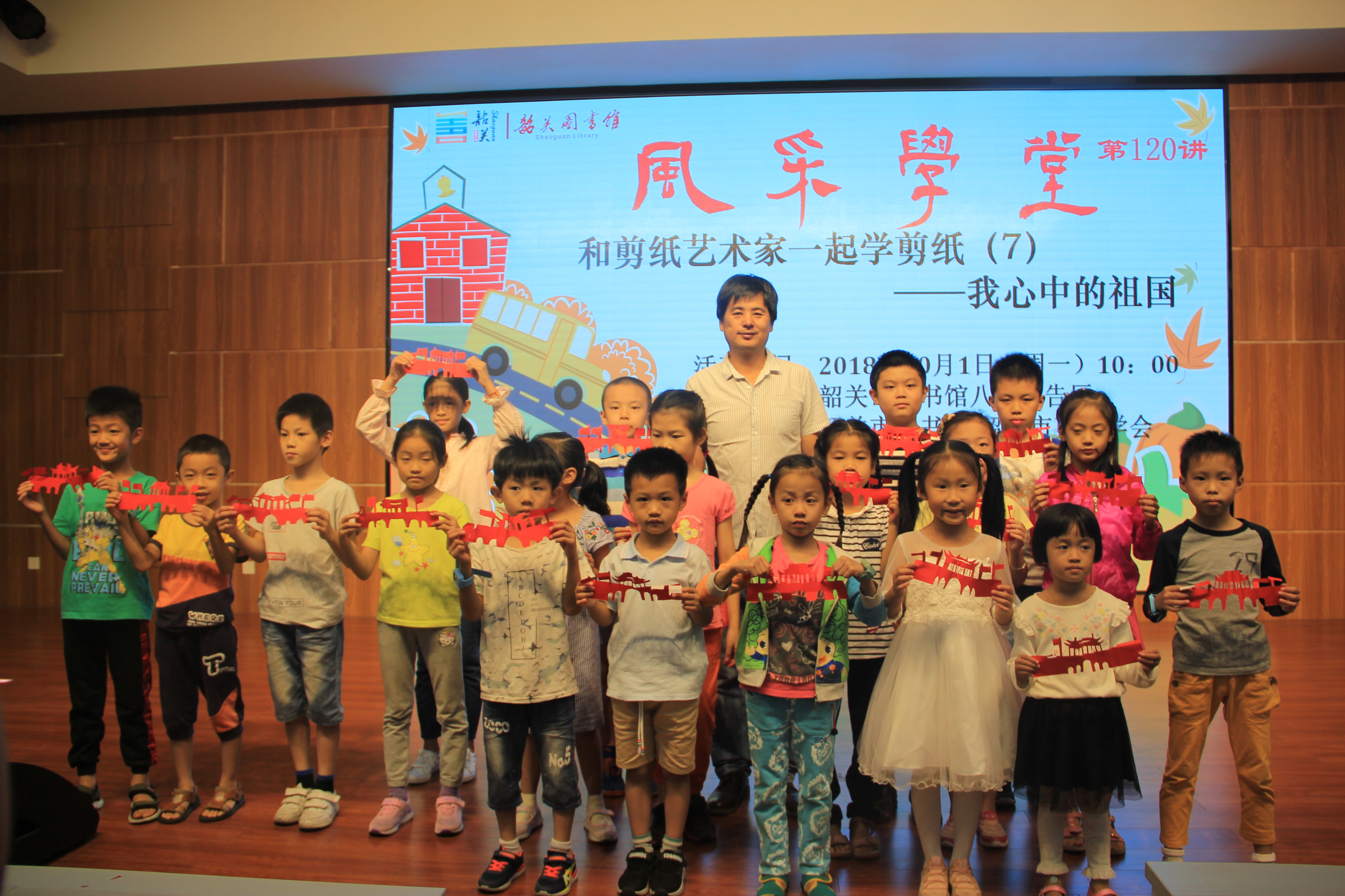 10月1日上午10点,由韶关市图书馆与韶关市剪纸学会联合主办“和剪纸艺术家一起学剪纸(7)我心中的祖国”在我馆八楼报告厅举行。本次活动由韶关市剪纸学会会长潘奇老师主讲,吸引了30多个家庭参加,有的是在韶关市图书馆微信公众号报了名的,有的是通过韶关新闻媒体慕名而来的,值得一提的是有一对七八十岁的老夫妇对剪纸特别感兴趣,也是通过这种方式而来,可见新闻媒体的力量多么强大。